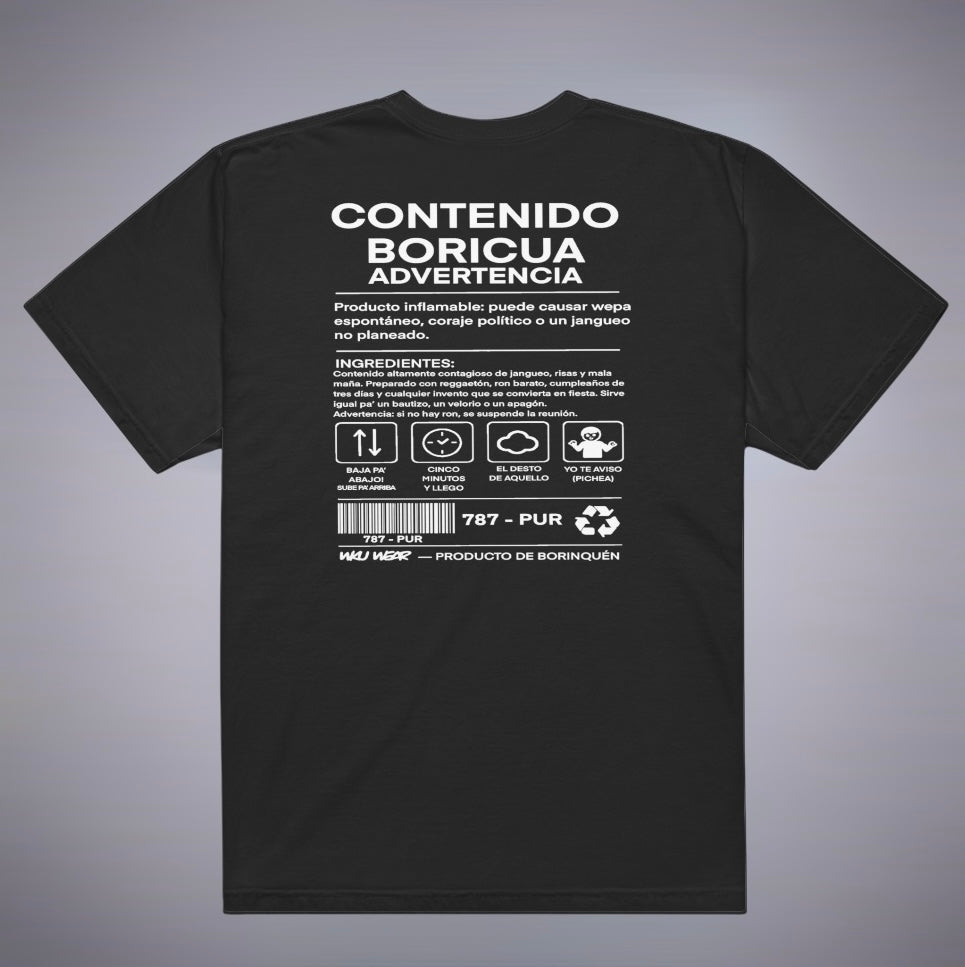 Esta pieza captura la esencia única de la cultura boricua. En el frente, un coquí con audífonos simboliza la conexión entre identidad y música. En la espalda, un diseño inspirado en etiquetas de producto presenta frases y elementos que reflejan con humor y autenticidad la vida en Puerto Rico.